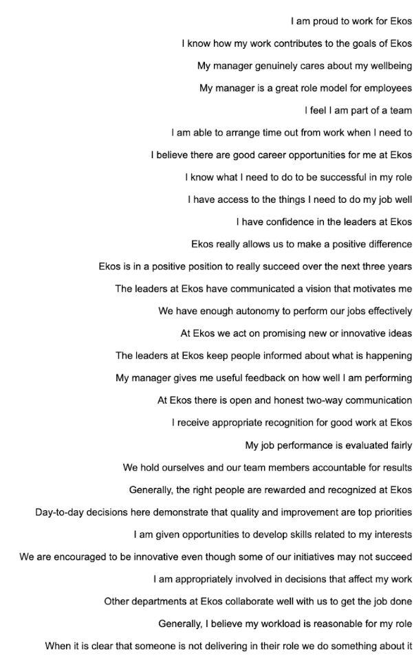 If you’re thinking of running your own employee survey and you don’t know where to start, here’s a list of survey statements (that employees rated on a scale from “strongly disagree” to “strongly agree”) that we used for our own employee survey.