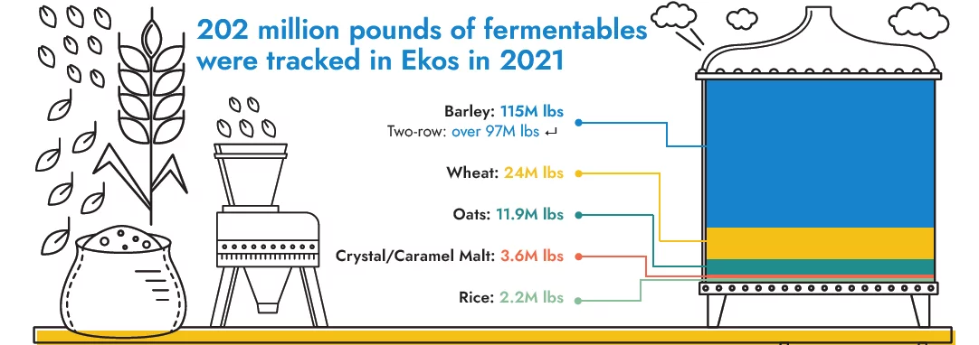 It will come as no surprise to craft brewers that barley is the top fermented grain tracked in Ekos, but the actual amount (115 million pounds!) is impressive. We also noted that the vast majority of that barley was two-row malted barley, commonly considered the most popular variety among brewers. When it comes to the rest of the top five grains, wheat (24 million pounds) and oats (11.9 million pounds) fell in the middle of the pack, and crystal/caramel malt (3.6 million pounds) and rice (2.2 million pounds) followed.
