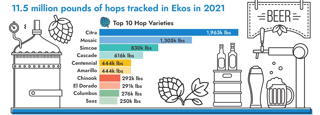 Hops — and which ones are the best — can be a heated topic in the brewing community, and we wondered which ones pop up most frequently in Ekos. With more than 11.5 million pounds of hops tracked in Ekos last year, we have a lot of data to work with! While some hop reports gather information through self-reported surveys or hop harvest numbers, we used the real-time production data in our system to find which varieties were actually purchased and tracked throughout the year. Here’s what we found.